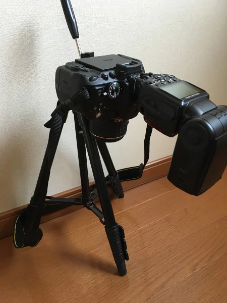 Fotopro DIGI-204 の耐荷重は 1.5kg。これに対し、カメラとレンズで 676g、フラッシュで 420g。合計で約 1.1kg。1.5kg までの耐荷重があっても、少し下に傾けると写真の状態になり、ぜんぜん安定しませんでした。