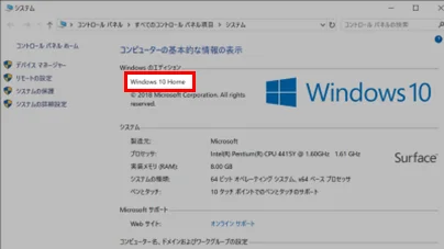 コントロールパネルのシステムから「Windows10 Home」になっていることを確認します。