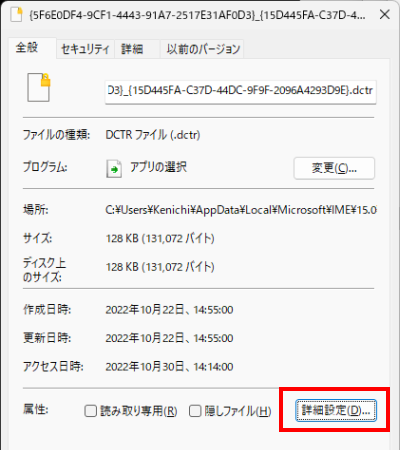 該当ファイルを選択し、右クリックでプロパティを開き「全般」タブの一番下にある「詳細設定」ボタンを押下します。