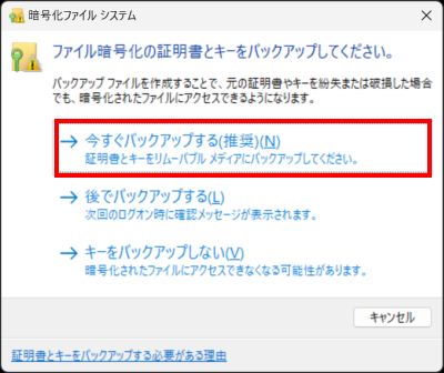 Windows10/11 「ファイル暗号化の証明書とキーをバックアップしてください。」が出たらやること
