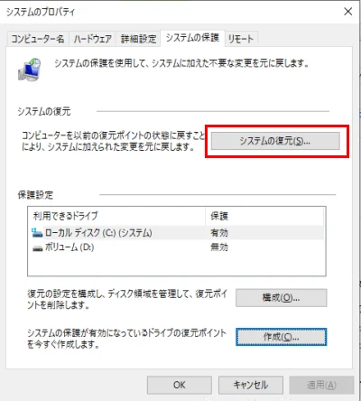 Windows10 システムの保護を有効化・復元ポイントを作成して万が一に備える
