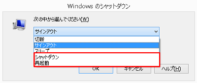 Windowsのシャットダウン画面が出てきたら、プルダウンから再起動やシャットダウンを選んで、OK ボタンを押下してください。